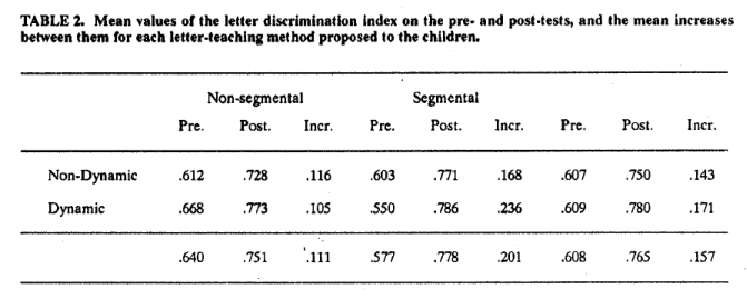 Researchers tested letter discrimination in preschool children using segmental versus dynamic teaching conditons.